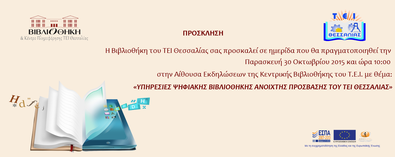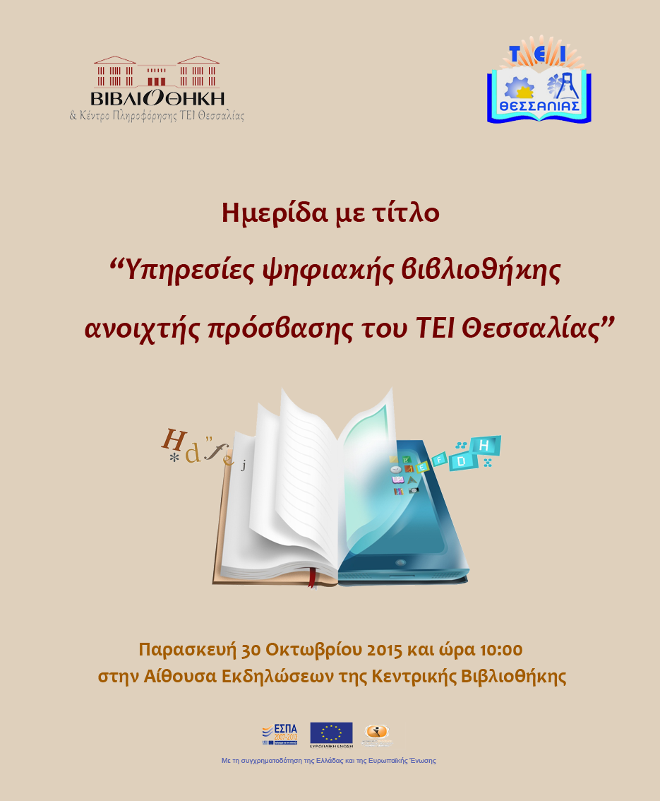 Η Βιβλιοθήκη του ΤΕΙ Θεσσαλίας σας προσκαλεί σε ημερίδα που θα πραγματοποιηθεί την Παρασκευή 30 Οκτωβρίου 2015 και ώρα 10:00 στην Αίθουσα Εκδηλώσεων της Κεντρικής Βιβλιοθήκης του Τ.Ε.Ι. με θέμα: