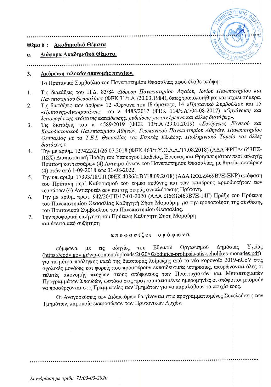 Σας ενημερώνουμε ότι, ύστερα από τα τελευταία μέτρα που ελήφθησαν για την αποφυγή της διασποράς κορωνοϊού COVID-19, ακυρώνονται όλες οι προγραμματισμένες απονομές πτυχίων στους αποφοίτους όλων των Τμημάτων του Πανεπιστημίου Θεσσαλίας, καθώς και στους αποφοίτους των Τμημάτων των πρώην ΤΕΙ Θεσσαλίας και Στερεάς Ελλάδας.
