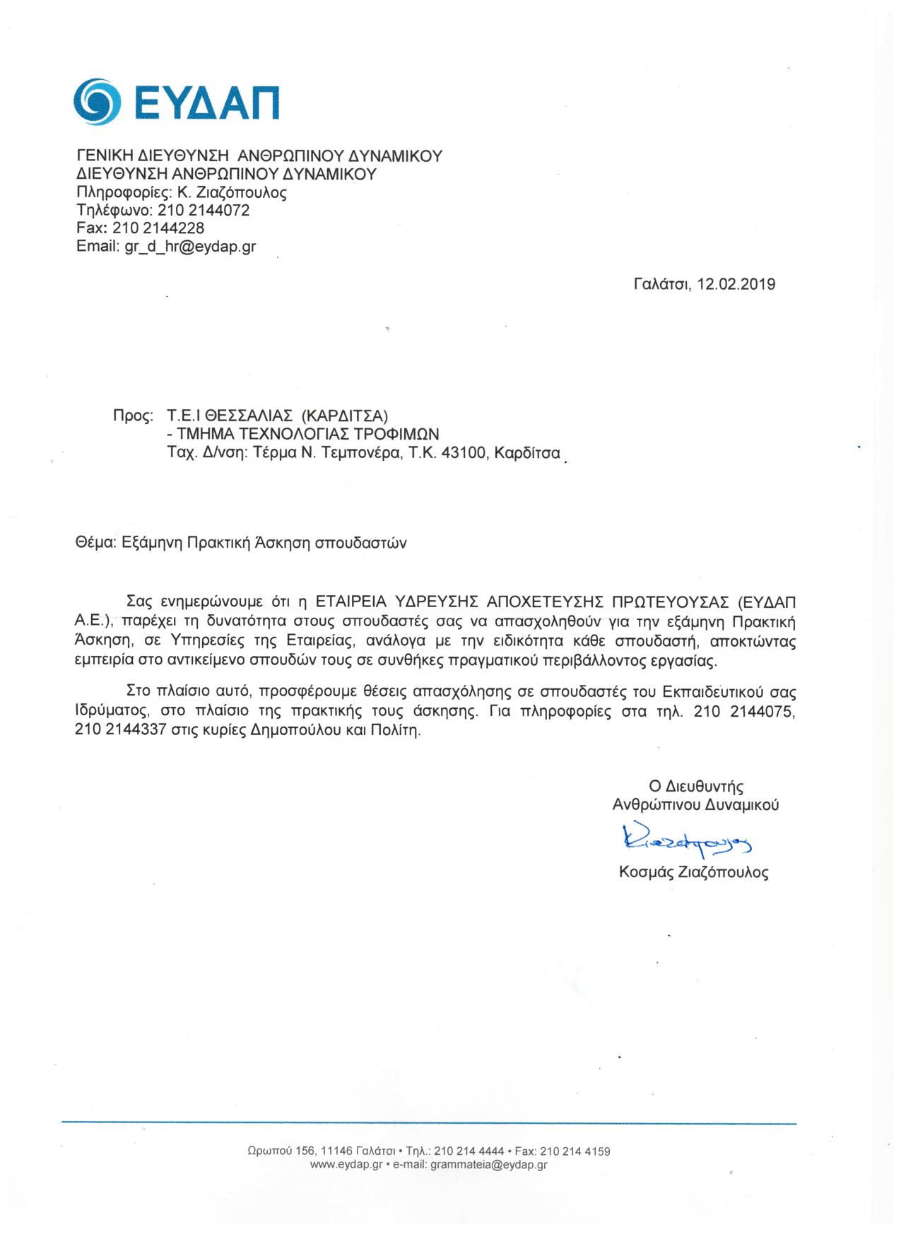 ΕΥΔΑΠ - ΠΡΟΣΦΟΡΑ ΓΙΑ ΠΡΑΚΤΙΚΗ ΑΣΚΗΣΗ