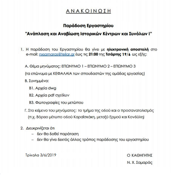 AΝΑΚΟΙΝΩΣΗ ΠΑΡΑΔΟΣΗΣ ΕΡΓΑΣΤΗΡΙΟΥ "ΑΝΑΠΛΑΣΗ Ι"