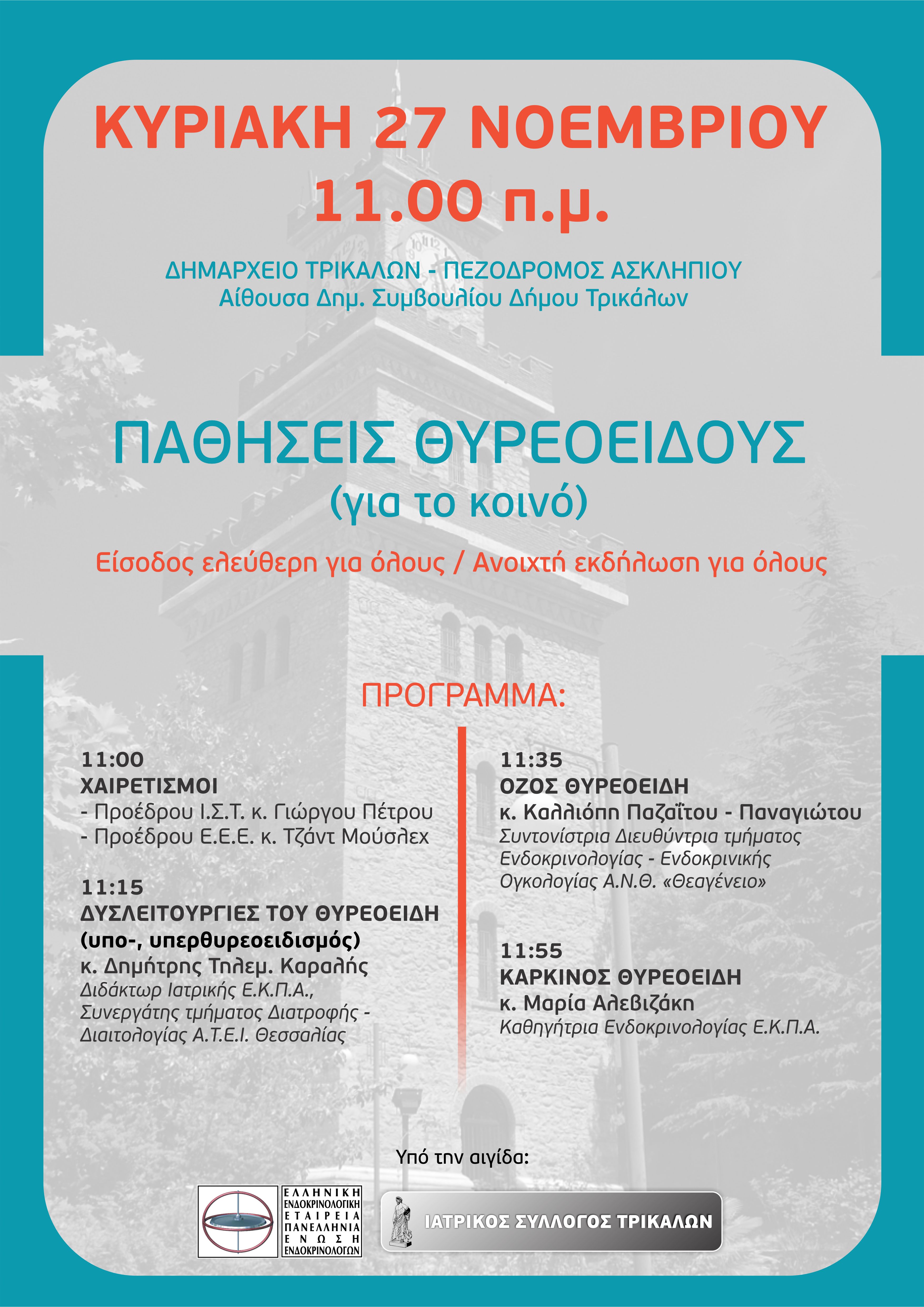 Την Κυριακή 27 Νοεμβρίου, στα πλαίσια της 30ης Μετεκπαιδευτικής Συνάντησης Ενδοκρινολόγων, εκπρόσωποι του τμήματος θυρεοειδούς της Ελληνικής Ενδοκρινολογικής Εταιρείας θα αναπτύξουν το θέμα "Παθήσεις Θυρεοειδούς" στην αίθουσα συνεδριάσεων του Δημαρχείου Τρικάλων.